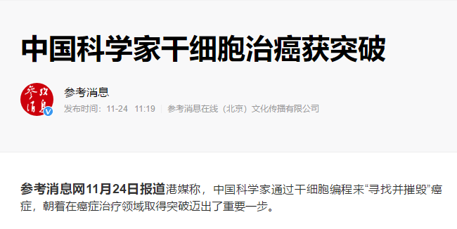 2020-02-11 查看更多參考消息網(wǎng)11月24日?qǐng)?bào)道港媒稱,中國(guó)科學(xué)家通過(guò)干細(xì)胞編程來(lái)“尋找并摧毀”癌癥,朝著在癌癥治療領(lǐng)域取得突破邁出了重要一步。據(jù)…